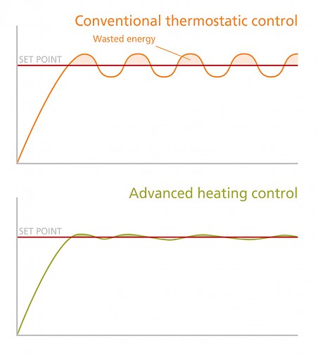 If we look at temperature control, we see that the typical thermostatic control of most houses allows the temperature to wander up and down by one or two degrees. This is because the thermostat has inherent hysteresis. It only switches the heating off when the temperature has already risen above the desired temperature - far too late! Just a one degree decrease in temperature setpoint can save around 10% of energy costs. So if we can control temperature closely we can prevent overheating, increase comfort and use less energy.
